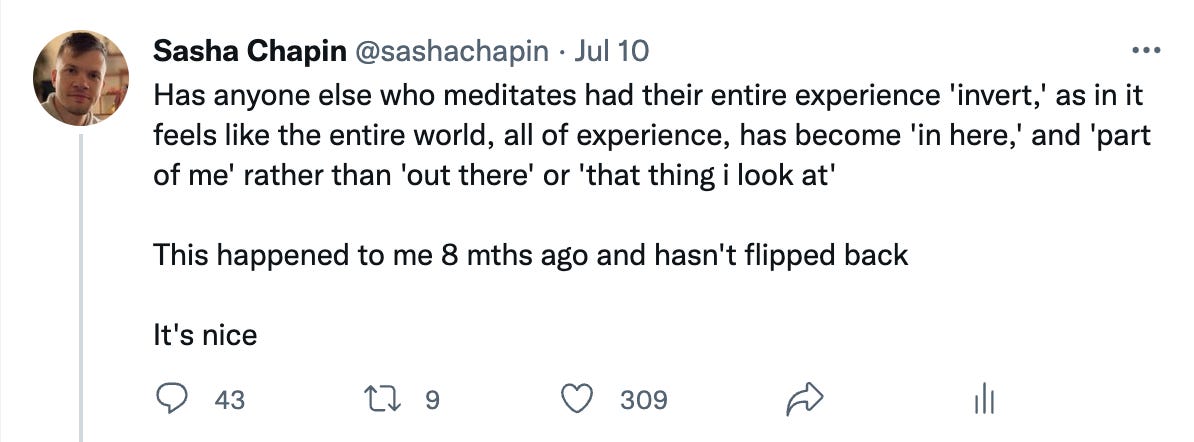 Meditation was quite bad for me in general at this point. (This isn’t totally uncommon—here’s one great little post, of many that exist, on meditation risk.) So I stopped meditating and got my shit together. But I occasionally thought of those experiences of self/other dissolution with nostalgic fondness. Like, hey, remember that town we visited on our road trip? Non-dual town? I wonder if that cute gift shop is still there.